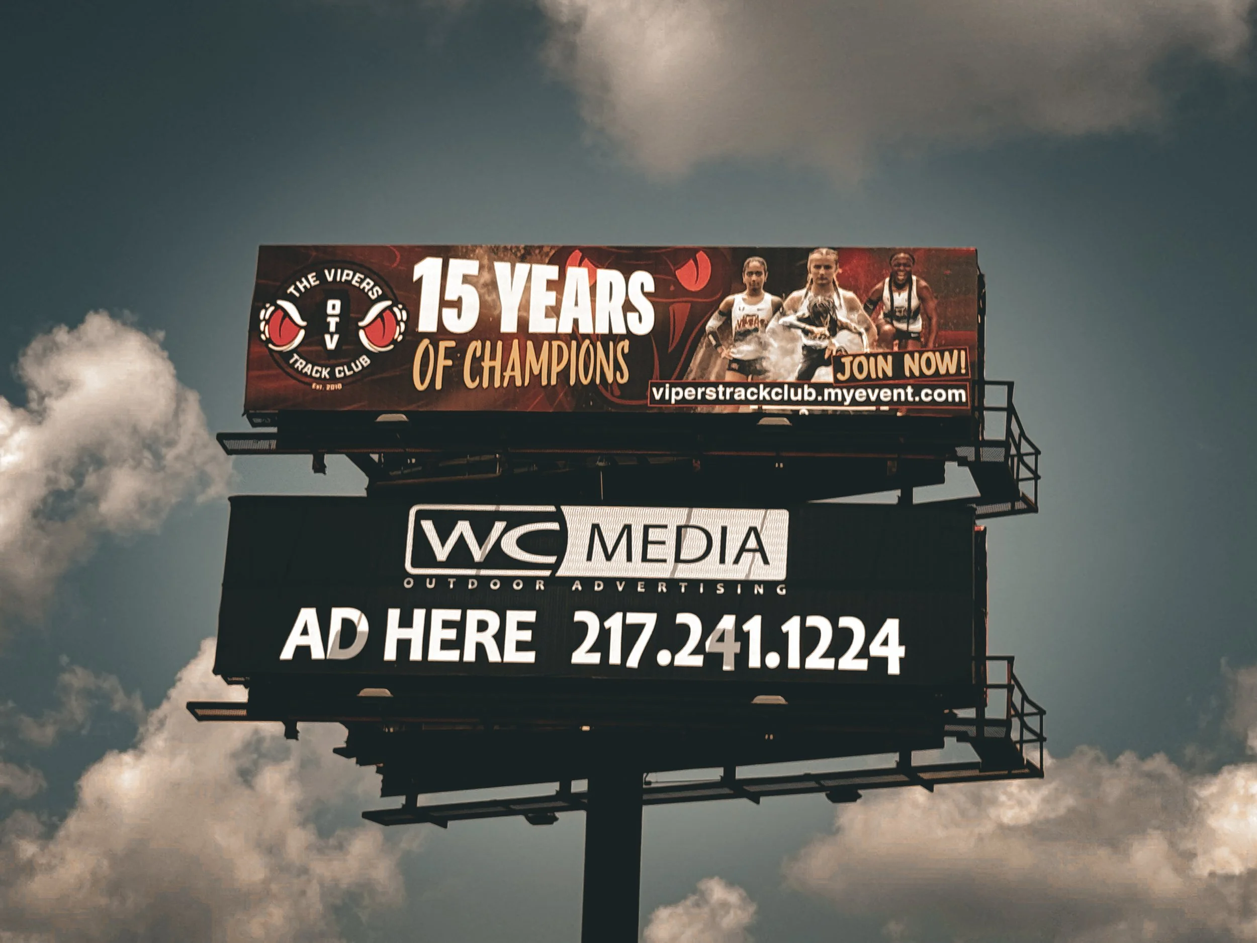 Vipers Track Club approached me to create a large-format billboard celebrating their 15th anniversary and recruiting new athletes for the upcoming season. The goal was to balance bold celebration with clear information that drivers could understand in just a few seconds.
